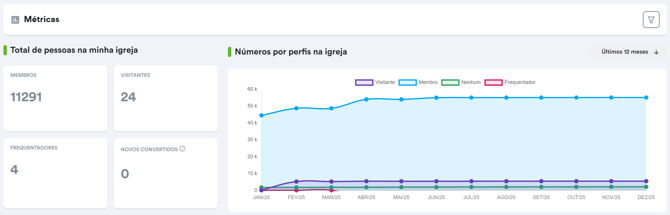 Dentro de Pessoas, existe a área Métricas, onde é possível verificar informações compiladas sobre os Membros, Visitantes e Frequentadores.