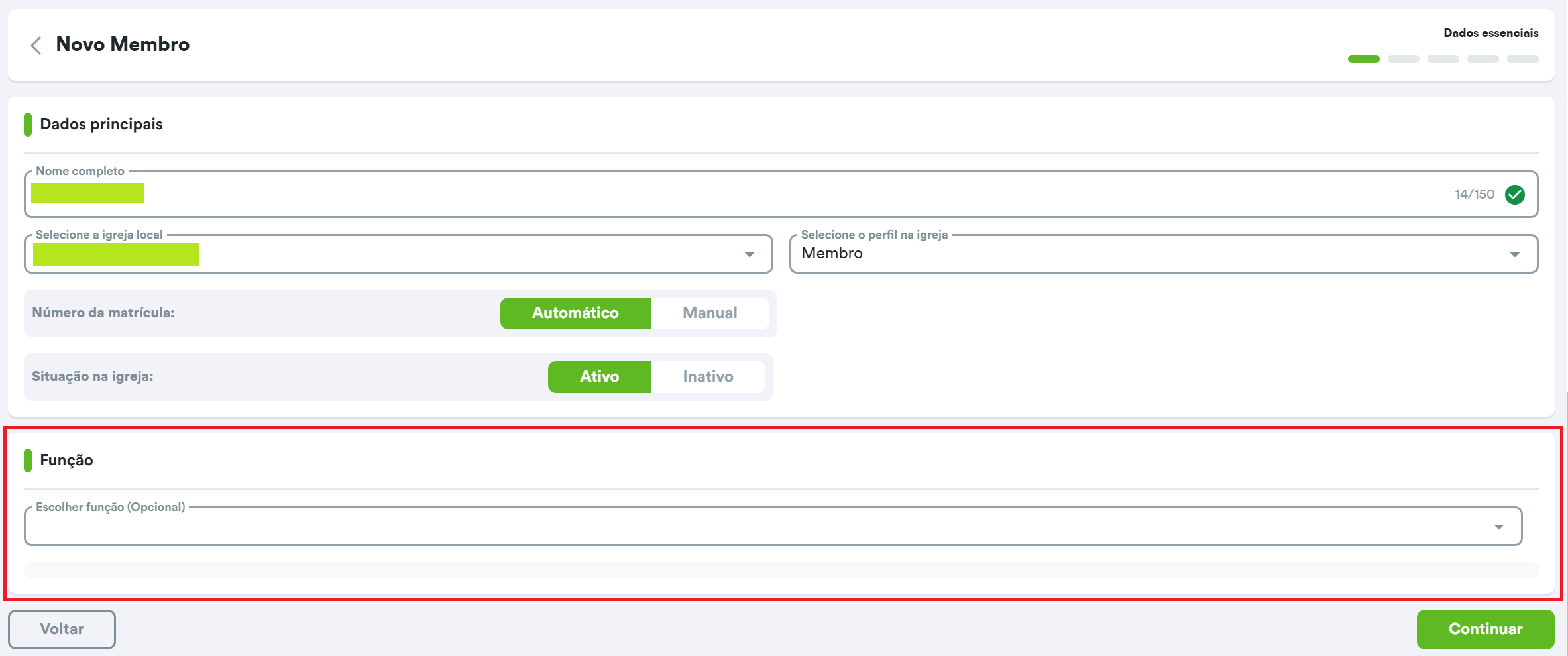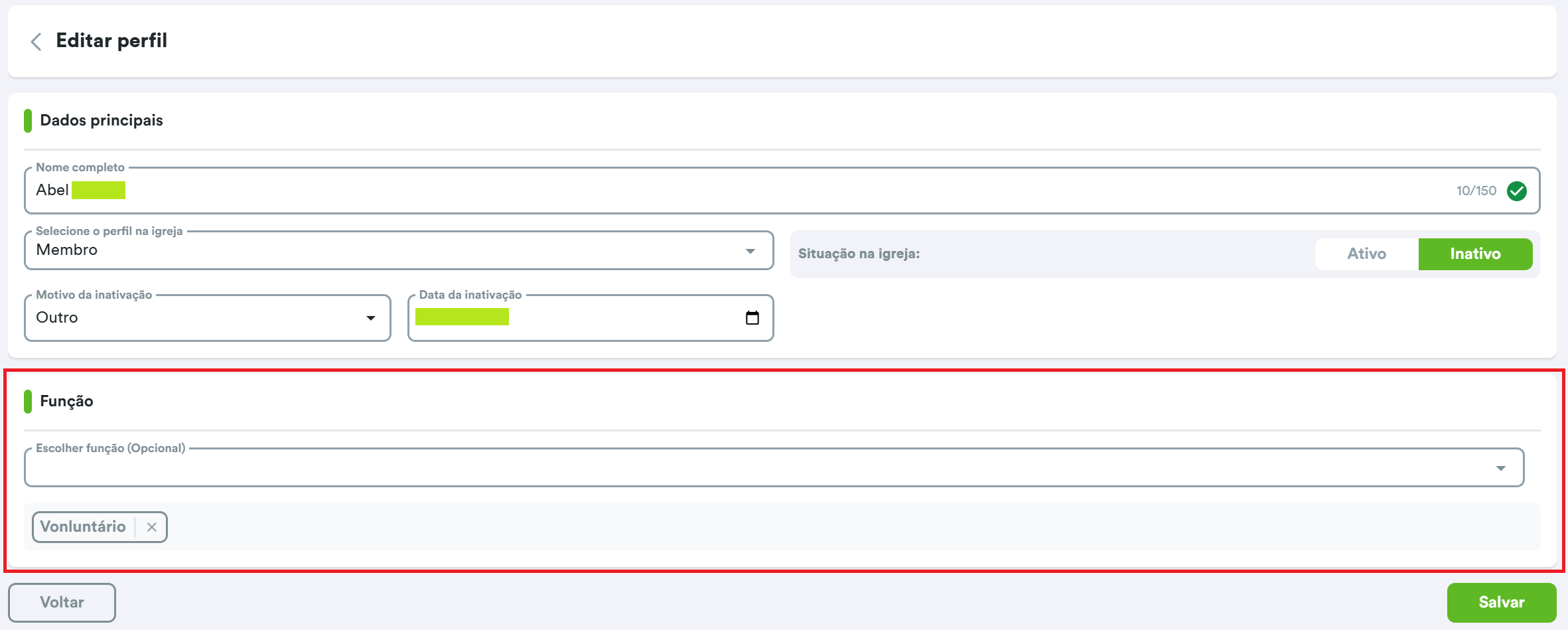 Já no perfil do membro | Quando criamos ou editamos um perfil, o campo de função deve aparecer assim que o tipo de perfil é sinalizado como membro.