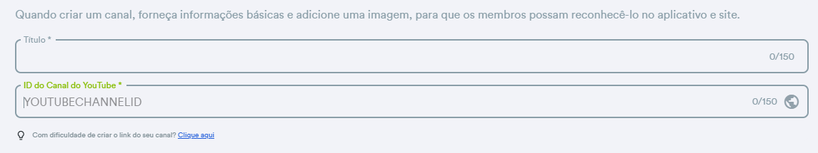 5. No campo ID do Canal do YouTube, na área de dados essenciais, insira somente o ID do Canal retirado do Youtube: