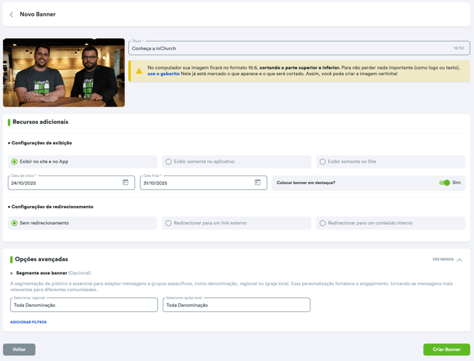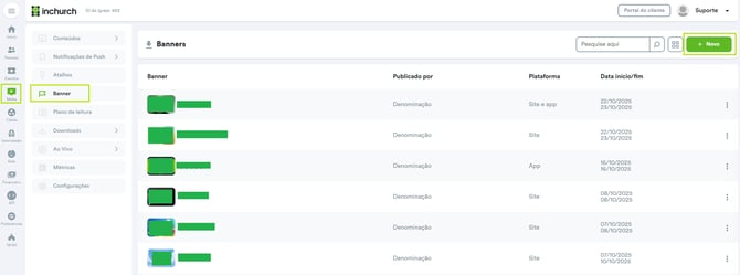 Nessa área será possível visualizar a listagem de todos os banners já criados, assim como um compilado de detalhes, como imagem, nome, para que igreja foi publicado, plataforma e datas de início e fim.