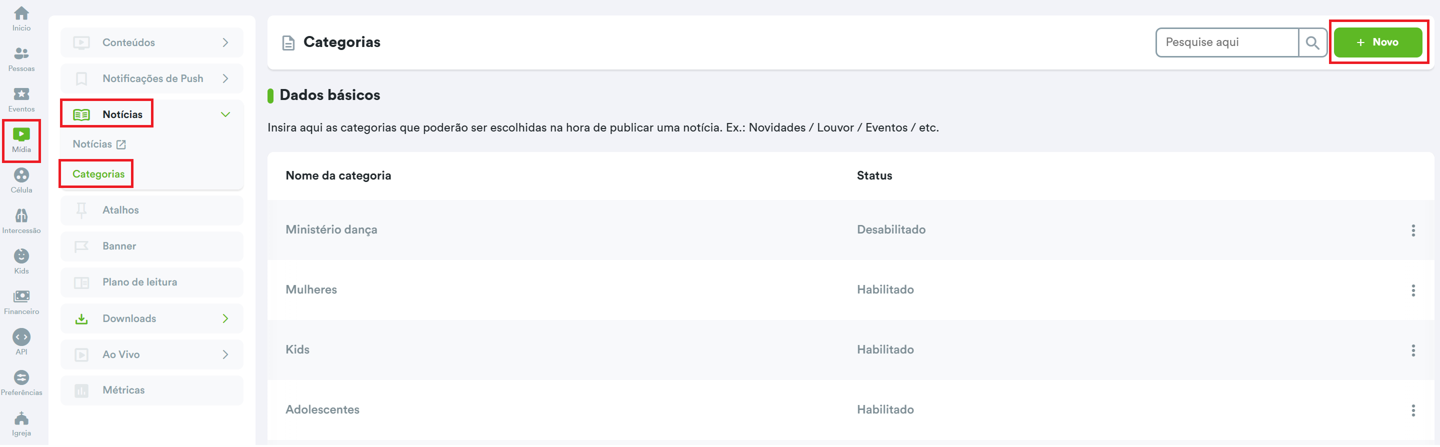 Nessa área aparecerão todas as categorias já criadas com seus respectivos status (habilitada = aparecerá como categorias na criação de Notícias; e desabilitada = não aparecerá na criação de notícias), além da criação de novas categorias, clicando no botão + Nova.