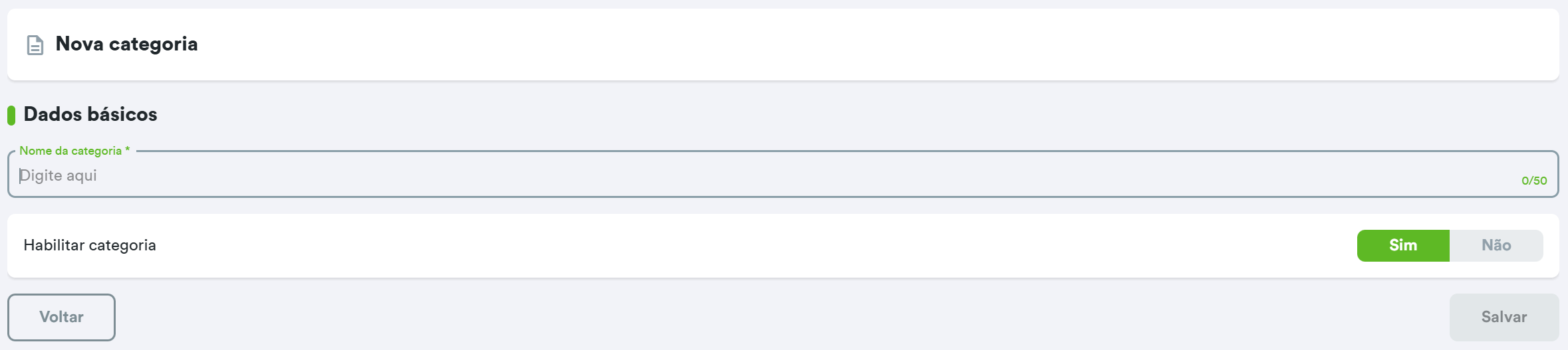 Ao criar uma nova categoria, será necessário incluir o nome da categoria desejada e sinalizar se ela está ou não habilitada para uso.