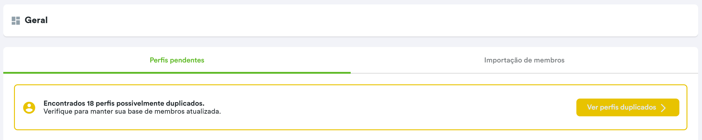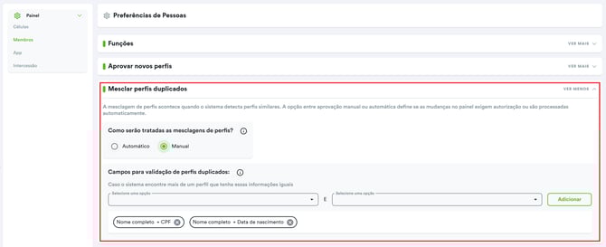 Para configurar essa área, é necessário acessar o Painel v2 > Preferências > Membros > Mesclar perfis duplicados