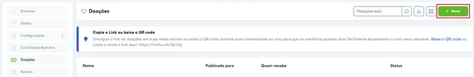Para criar uma nova Doação, é só clicar em + Novo, no cantinho superior direito da tela: