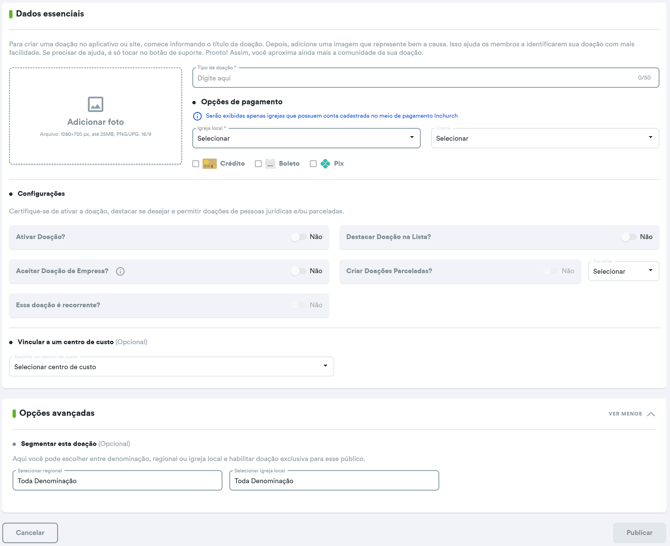 Essa página abrirá para que insira todos os dados da Doação, como o tipo de doação, a igreja local e a conta que irá receber, e algumas configurações como ativação da doação e se deseja que ela fique em destaque (aparece primeiro) entre as doações ativas: