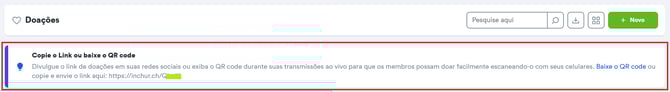 O código fica disponível na área de Doações, em Financeiro > Doações, logo no início da página.