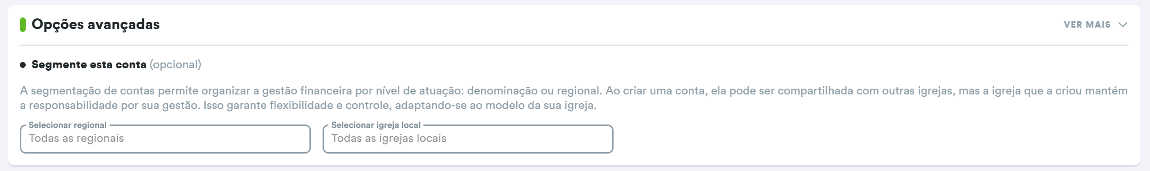 Ao criar contas, categorias, unidades de negócio e centros de custo, no final da página aparecerá a área "Opções avançadas", que permite selecionar a regional e a igreja local, caso desejem.
