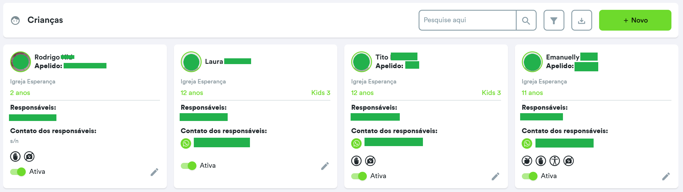 Nessa página, será possível visualizar detalhes como o nome da criança, o apelido que ela gosta de ser chamada, o nome e contato dos responsáveis, além das sinalizações de cadastro ativo ou inativo e restrições informadas pelos responsáveis.