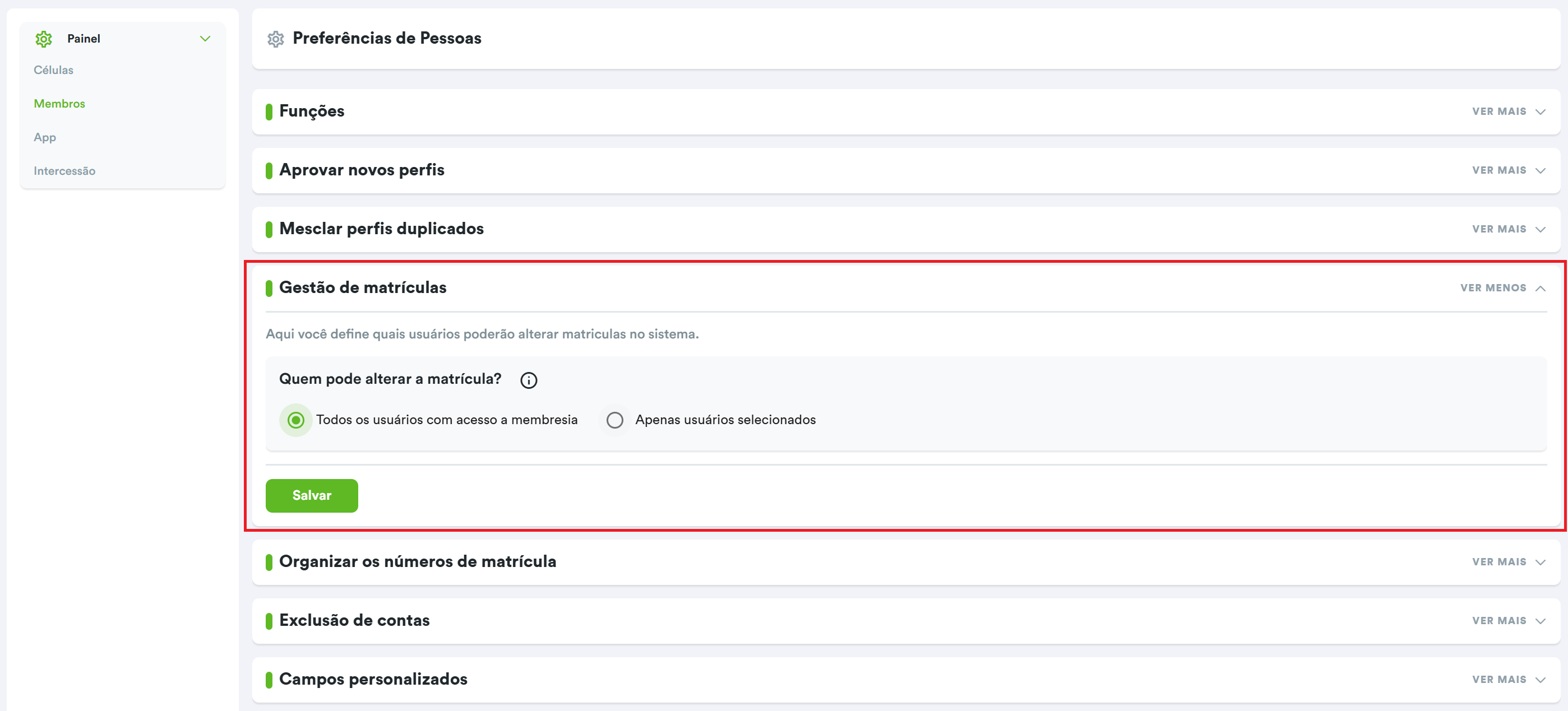 Para configurar quem terá permissões na edição de matrículas, é necessário acessar o Painel v2 > Preferências > Membros > Gestão de matrículas
