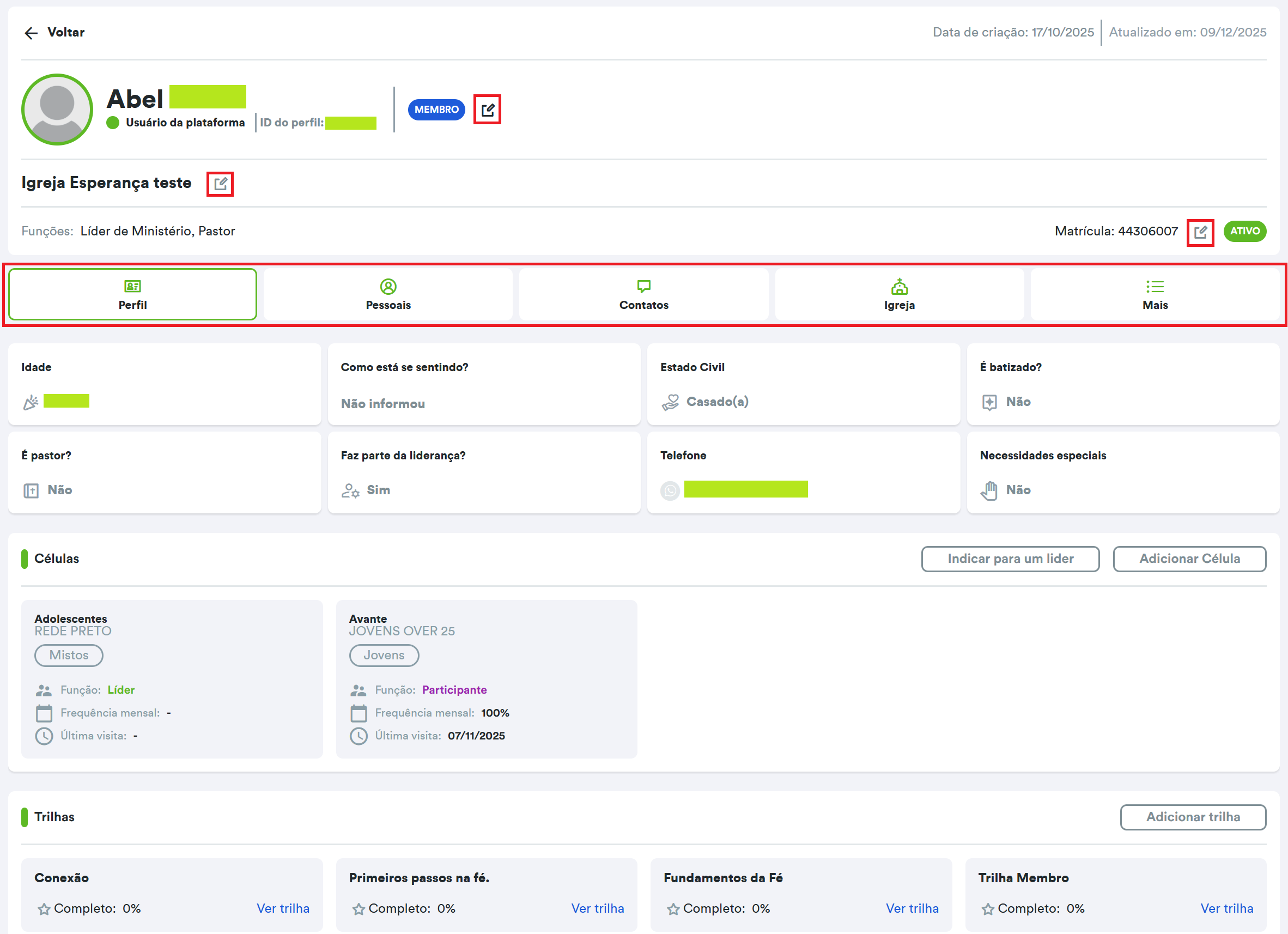 3. Acessando o perfil, será possível editar os dados do membro clicando nas categorias Perfil, Pessoais, Contatos, Igreja e Mais.