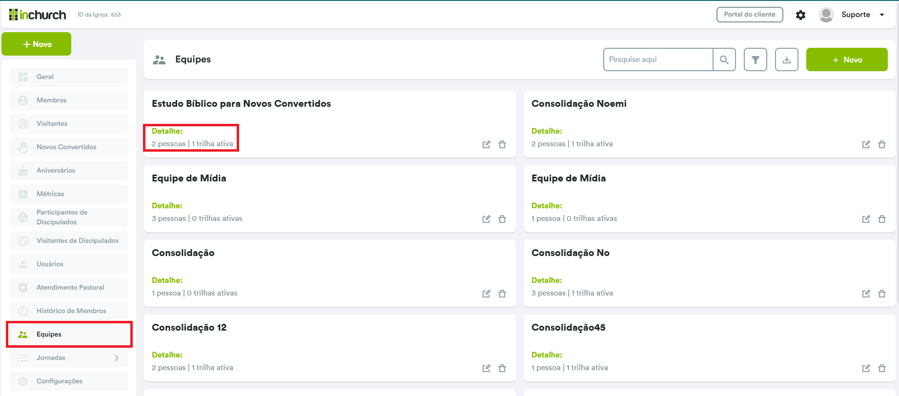 Onde será possível criar novas Equipes, clicando no botão +Novo, e também visualizar as Equipes já existentes, assim como a quantidade de pessoas que aquela equipe possui e a quantidade de trilhas ativas que estão sob os cuidados dela.