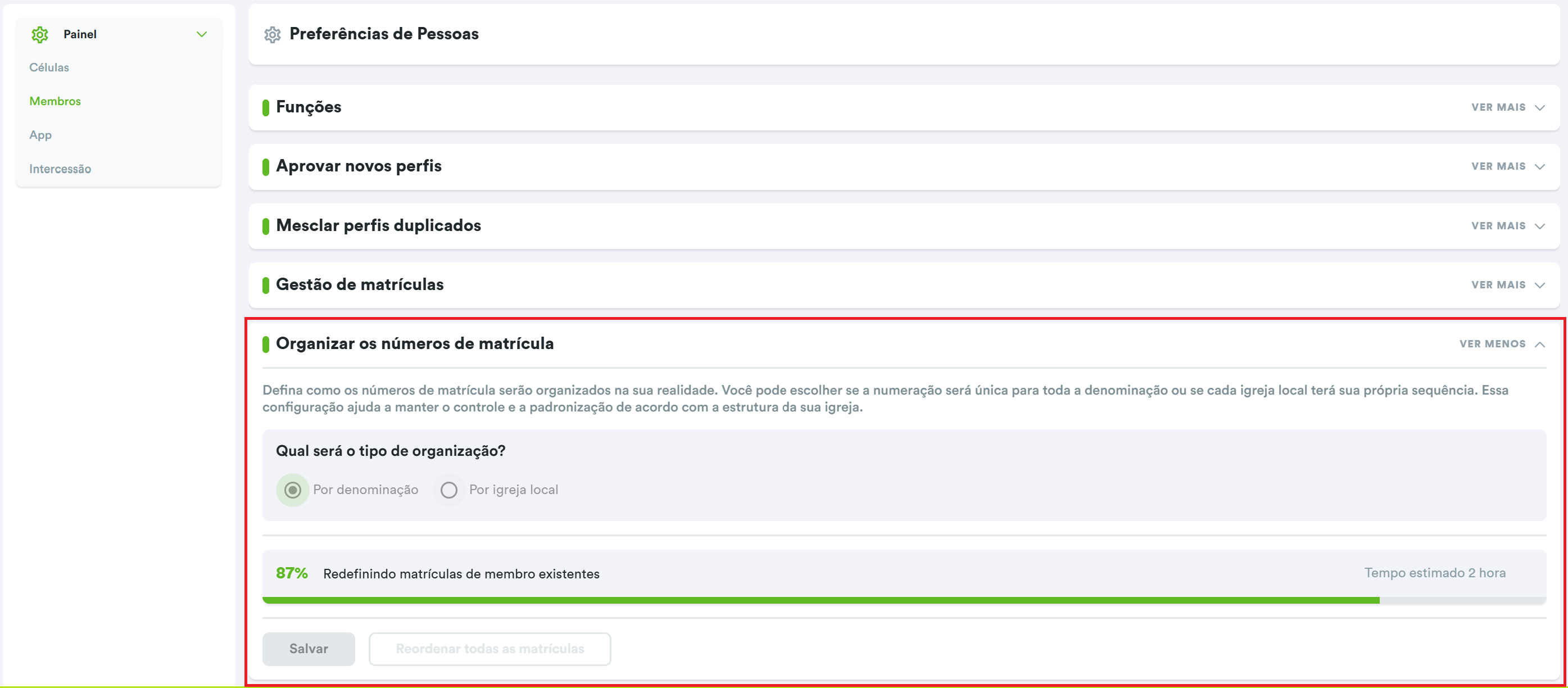 O administrador deve selecionar a opção Organizar os números de matrículas, e em seguida o painel mostrará as duas formas de definição de matrícula dos membros.