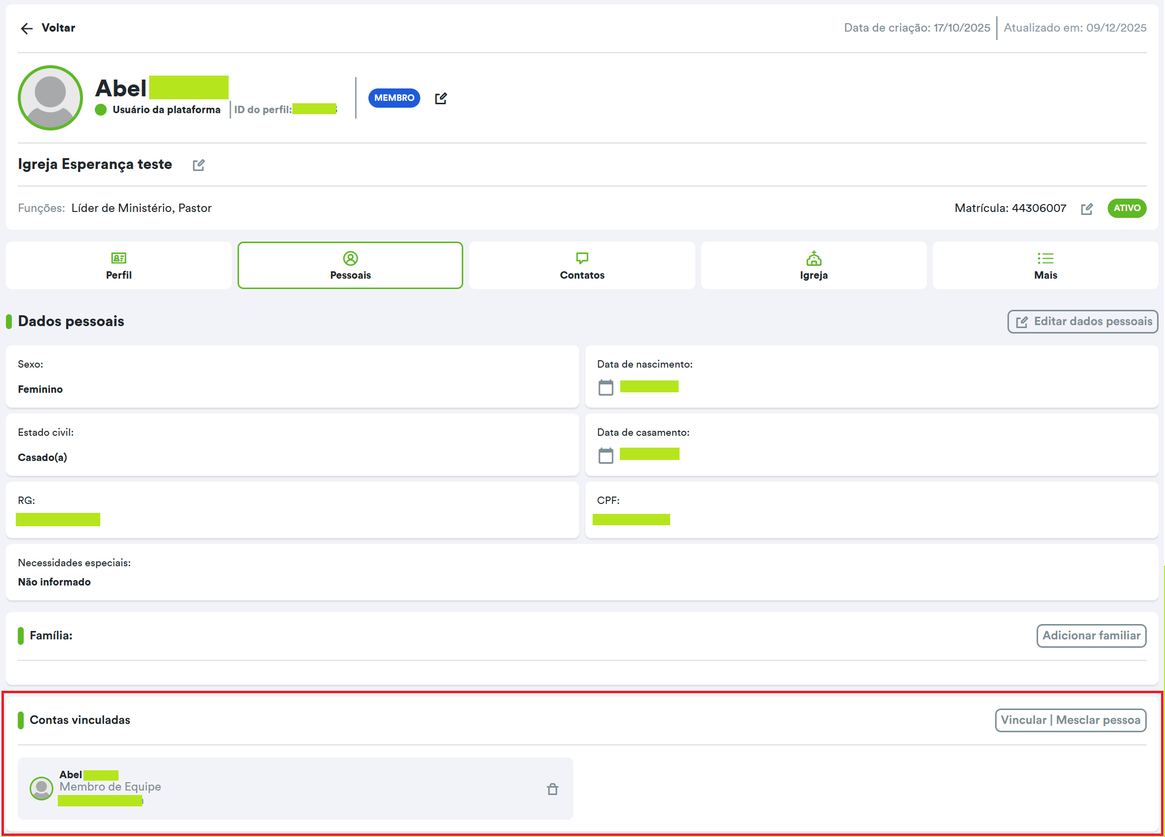 Ao acessar o perfil de membro, clique na aba "Pessoais", para verificar os dados pessoais, familiares e as “Contas vinculados”, que é a última área da página.