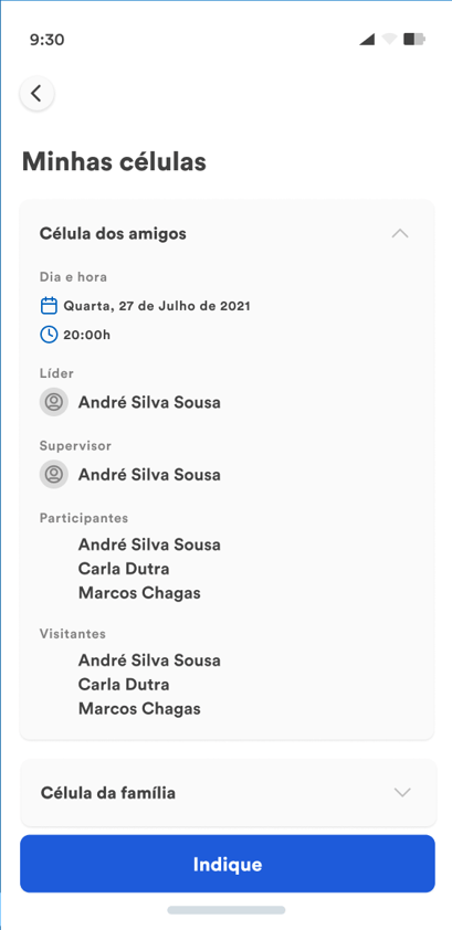 O Participante visualizará as células que participa, com data e horário da próxima reunião, Líder e Supervisor de célula e Participantes/Visitantes, além de conseguir indicar pessoas para a célula em questão.