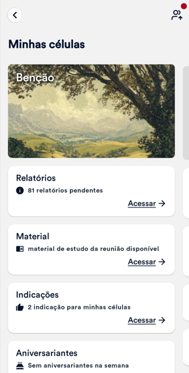 Essa área permitirá que o líder/auxiliar verifique informações como: relatórios, materiais da célula, indicações, aniversariantes e participantes e visitantes, além de conseguir preencher os relatórios das reuniões diretamente pelo aplicativo.