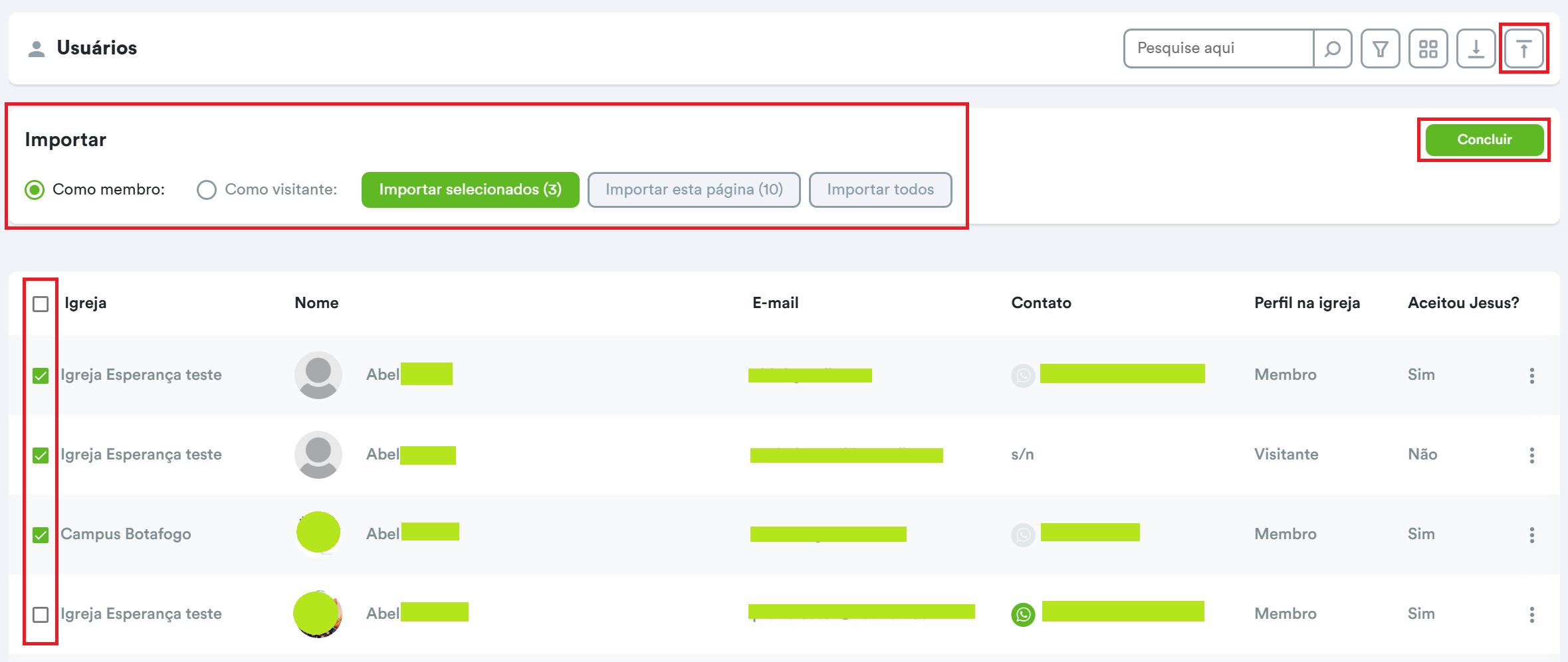 É só clicar em "Importar usuários" (botão que aparece com uma setinha para cima), marcar no cantinho esquerdo os usuários que deseja importar e sinalizar se eles serão importados como membros ou visitantes. Também é possível importar toda base de usuários, porém é necessário ter cuidado ao importar todos os usuários, pois essa ação não poderá ser revertida!